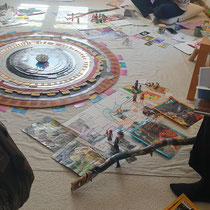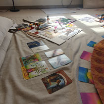 Nous tirerons d'abord les Cartes proposées par le Mandala de Cartes qui donneront la couleur et le sens de l'Espace ...puis après avoir nommé, analysés, intuités ouverts des compréhensions et des noeuds ..nous créerons un collage de Résolution à partir d’images découpées dans des magazines, photos, morceaux de tissus,...